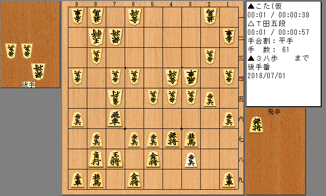 名人戦用に考えていた、初手▲7八飛を採用。以下予想通り相振り飛車になりました。浮き飛車を横に使って戦いになり、馬を作ったところではやや有利。そこから自然に指したつもりだったものの、形勢は難しくなっていきました。相手にも2枚飛車を並べられ、受けながらも相手玉を追います。都まで逃げられたものの、たまたま詰んで○。