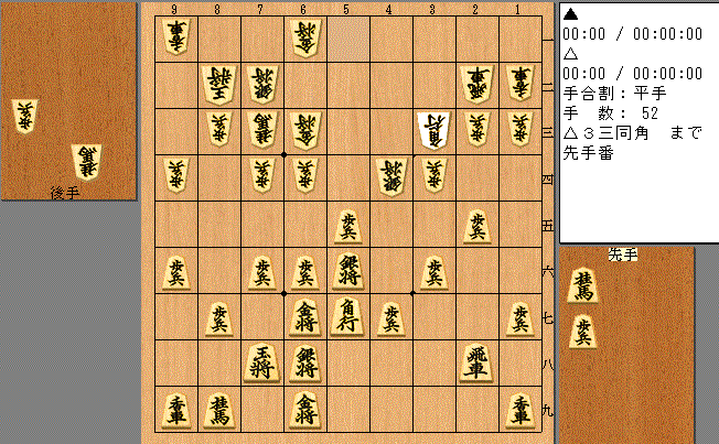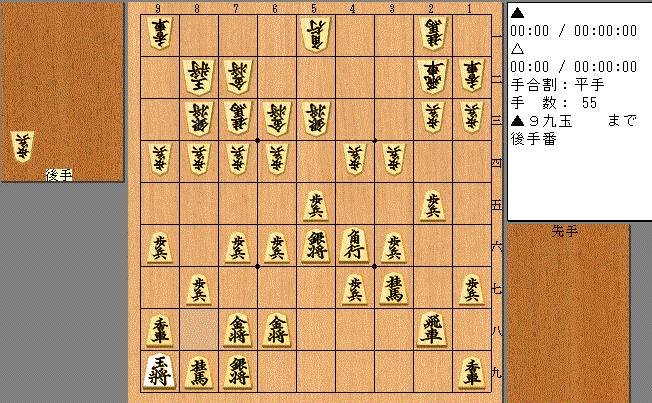 この手順、実は私と本家S木英春さんの実戦譜そのままです。英春さんは▲5五歩と突きましたが、角を追ってあっさり千日手に。私から打開する手もありますが、後手なので千日手で十分でしょう。