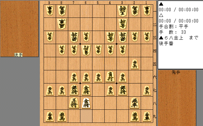 ▲6九玉 △4三銀 ▲5八金 △4二玉 ▲6八銀上 △3二金